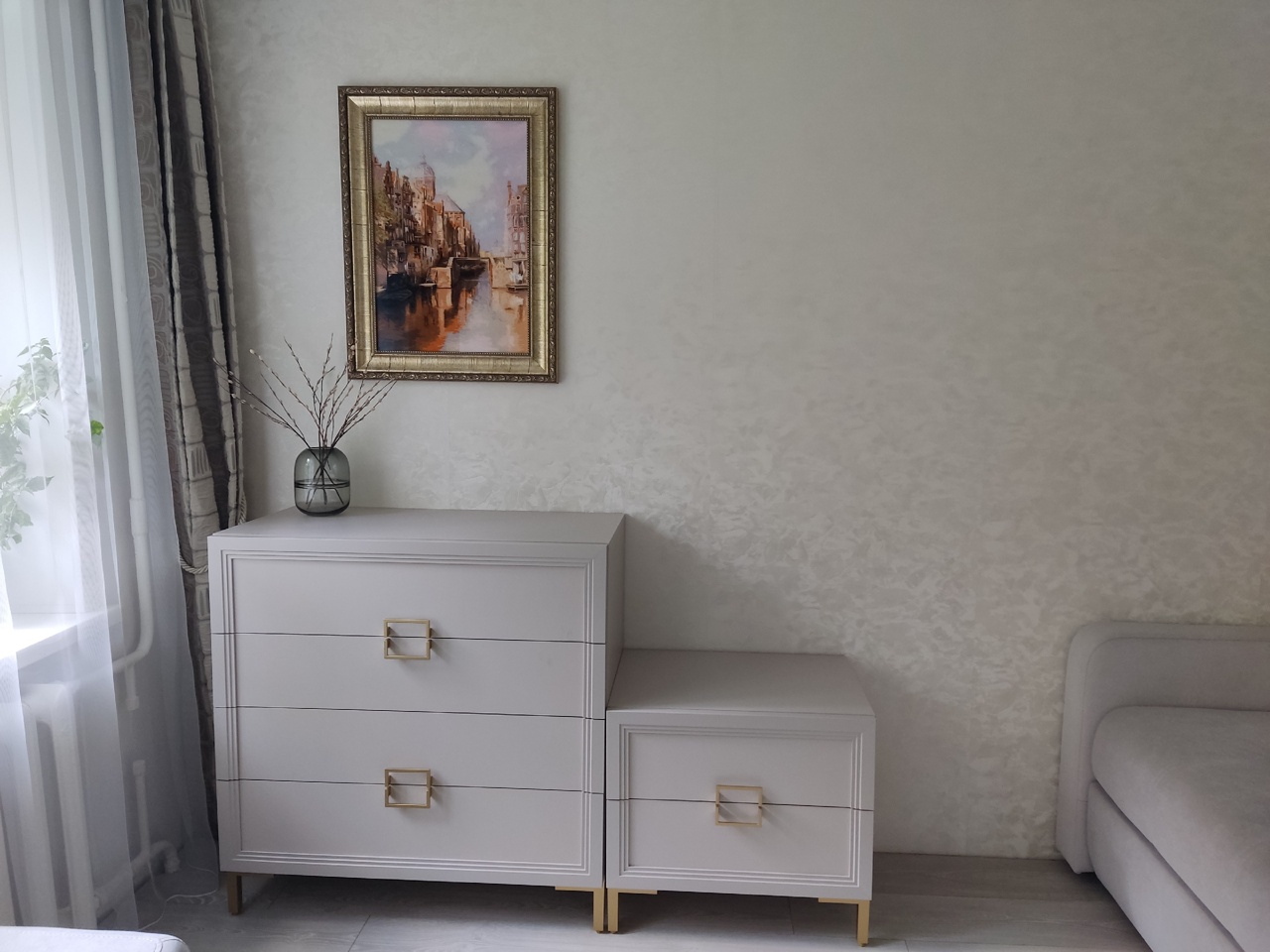 Элегантный лаконичный комод с четкими прямыми линиями будет превосходно смотреться в спальне, гостиной, прихожей, оформленной в стиле ар-деко или минимализм. Четыре выдвижных ящика визуально объединены рисунком квадратных ручек. Изящный сложный оттенок «серый кашемир», фурнитура и опоры «под золото» только усиливают эффектность мебели.