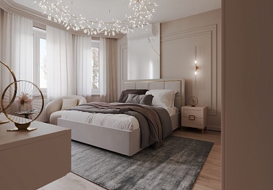 - Декоративная акцентная рама в изголовье кровати повторяет форму ручек.