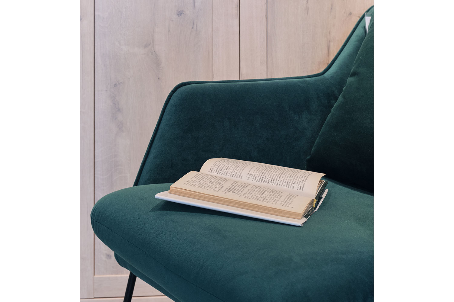 Мебель отличается повышенным уровнем комфорта. Спинка и подлокотники подстроены под анатомию человеческого тела. Подушка выполнена из пенополиуретана толщиной в 6 см, снабжена настилом из синтепона. В таком кресле приятно отдыхать, читать книгу, релаксировать в положении полулежа. Конструкция изготовлена из нейтральных, экологических чистых материалов — бруса хвойной породы, гнутоклееной фанеры и металлической трубы. Велюровая обивка насыщенного, темно-зеленого оттенка, которая впишется в помещение industrial или модерн.